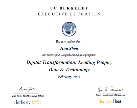 沈总完成美国伯克利大学哈斯商学院《数字化转型》课程 2021-11-24